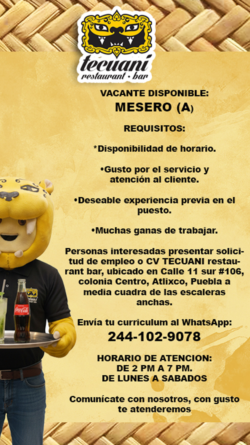 Vacante Mesero(a) - Tecuani restaurant bar (diciembre 2025)