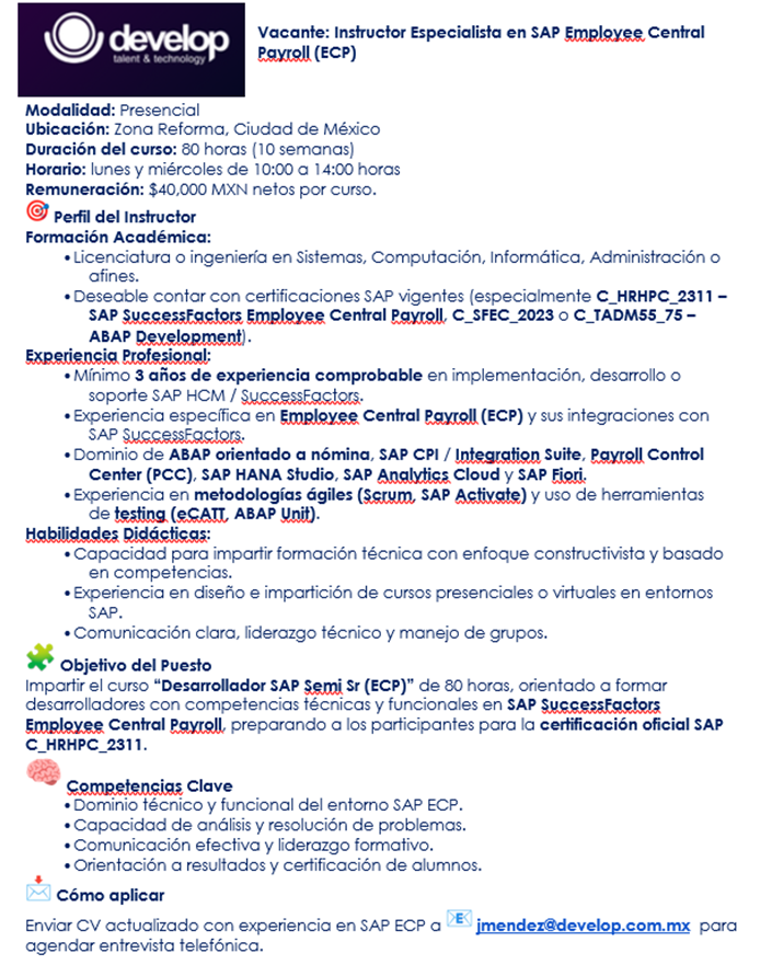 Vacante Instructor Especialista en SAP - DEVELOP (octubre 2025)