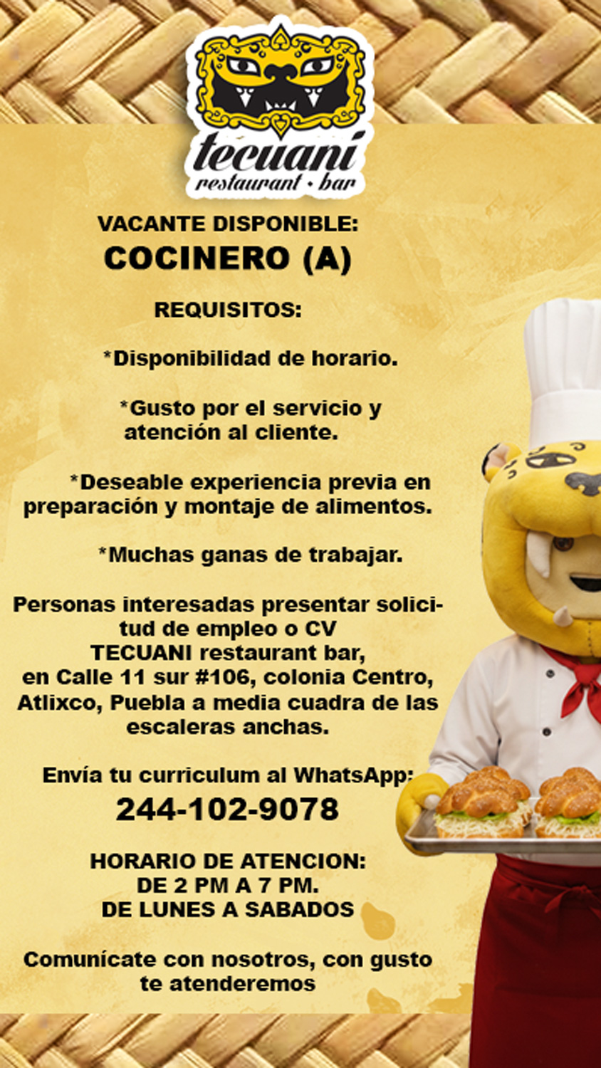 Vacante Cocinero(a) - Tecuani restaurant bar (diciembre 2025)