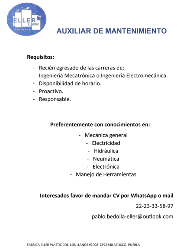 Vacante Auxiliar de Mantenimiento - ELLER PLASTIC (noviembre 2025)